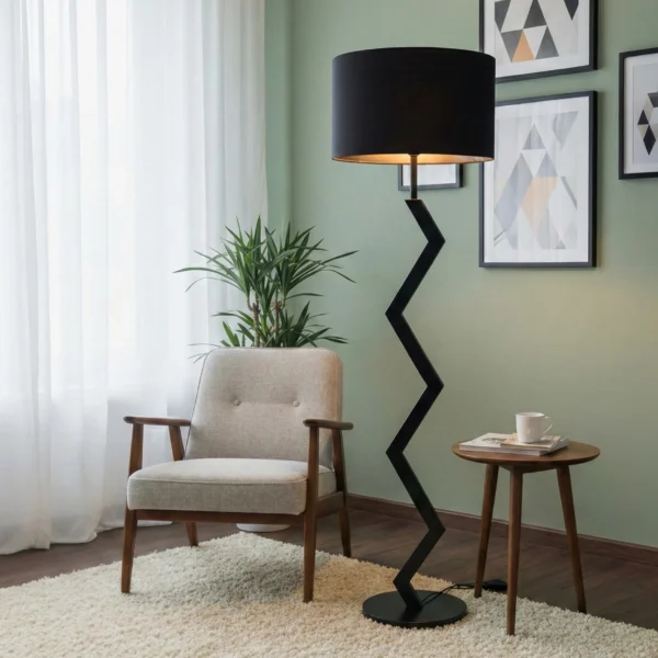 The Bolt floor lamp is defined by its striking geometric profile. The stand features a sharp, angular zigzag pattern made from black metal, giving it dynamic, kinetic energy. It is topped with a substantial black fabric drum shade that directs light tightly downwards and upwards, balancing the angular base with a clean, modern top.