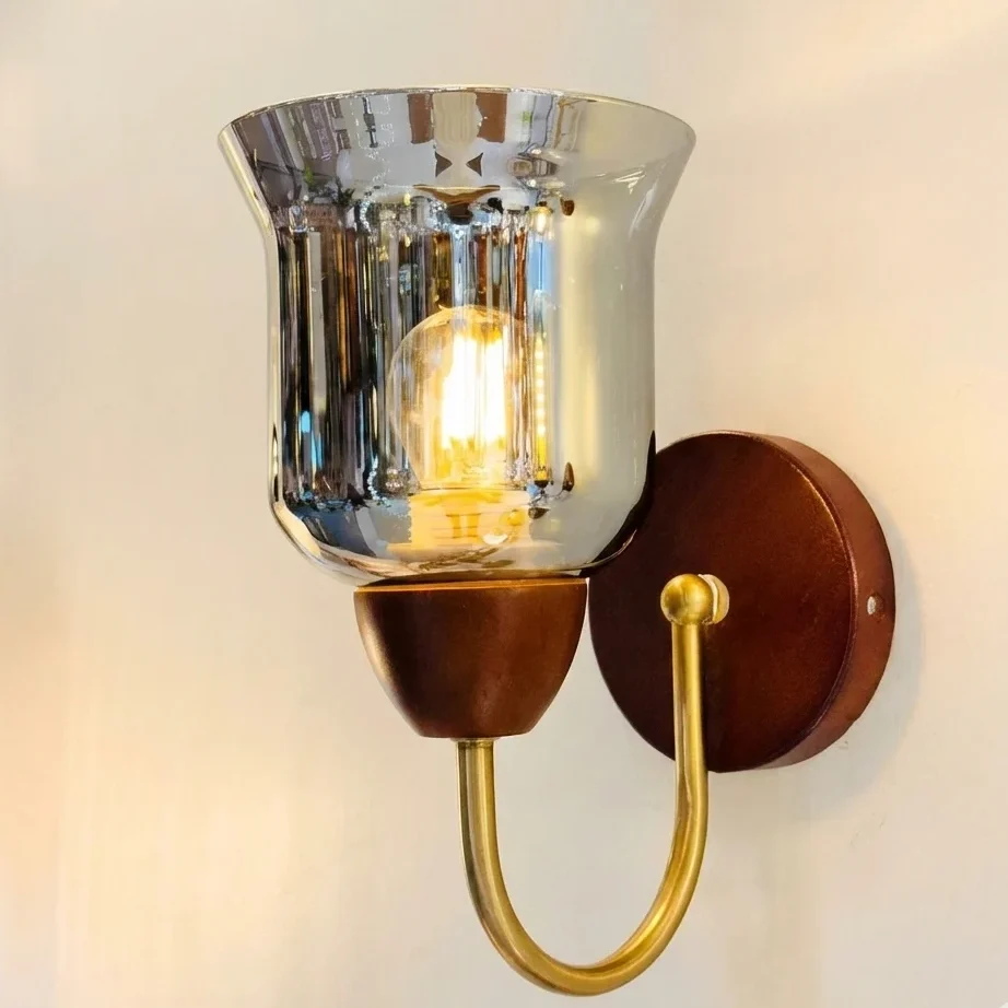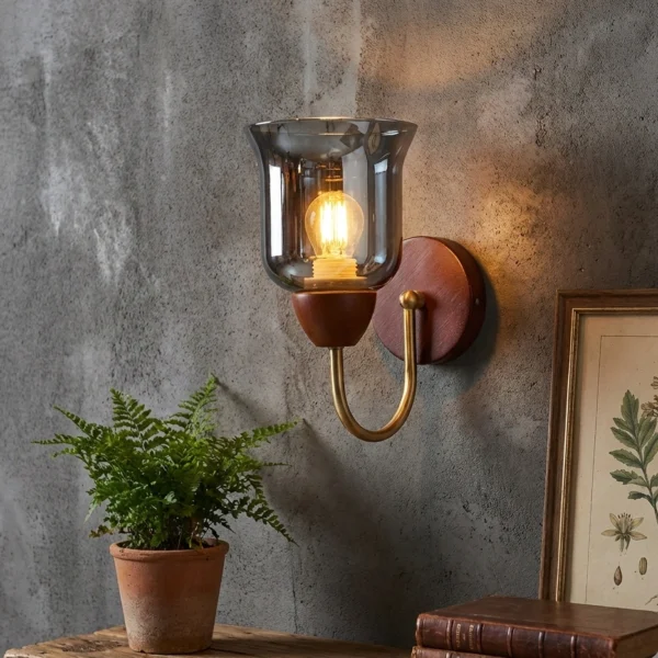 The Dusk wall sconce perfectly balances warm rustic tones with modern industrial elegance. It features a circular mounting plate and bulb cup crafted from rich, dark-stained wood, connected by a graceful, sweeping arm with an antique brass finish. The pièce de résistance is the smoky grey glass shade, which softens the light from an exposed filament bulb, casting a moody, warm glow that enhances the ambiance of any interior, particularly those with textured backdrops like concrete or exposed brick.