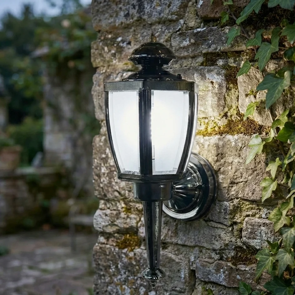 The Sentinel wall lantern brings timeless elegance and reliable illumination to exterior spaces. Crafted from durable weather-resistant metal with a traditional matte black finish, this fixture evokes the charm of vintage carriage lights. The frosted glass panels soften and diffuse the light source, casting a bright, cool white glow that effectively illuminates entryways, patios, and garden walls while enhancing the rustic or classic architecture of your home.
